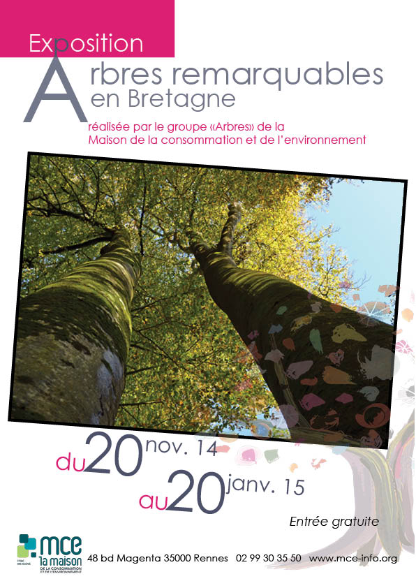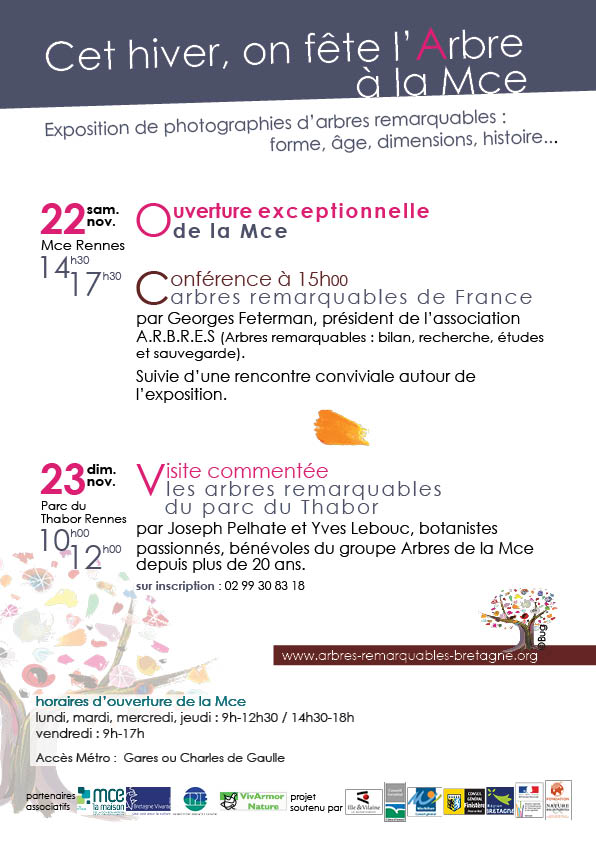 Exposition « Arbres remarquables en Bretagne » à Rennes Publié le 17 novembre 2014 par Yannick M. Samedi prochain, le 22, inauguration de l’exposition (voir le horaires plus bas), venez nombreux!Plan d’accès à la Mce (site internet ici et accès à l’inventaire des arbres remarquables là) Partager :PartagerFacebookTwitterE-mailWhatsAppWordPress:J'aime chargement… Articles similaires